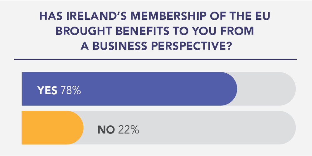 Respondents were largely positive about Ireland’s EU membership to date, with the Single Market cited as the biggest benefit of membership, followed by infrastructure investment and access to skills and talent. 95% of businesses believe that they will continue to benefit from Ireland's membership of the EU in the long term.