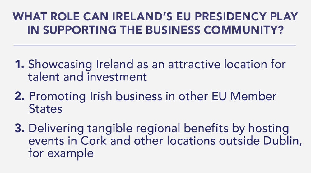Respondents underlined the importance of harnessing the EU Presidency to showcase Ireland as an attractive business location, promote Irish business abroad and deliver tangible regional benefits.