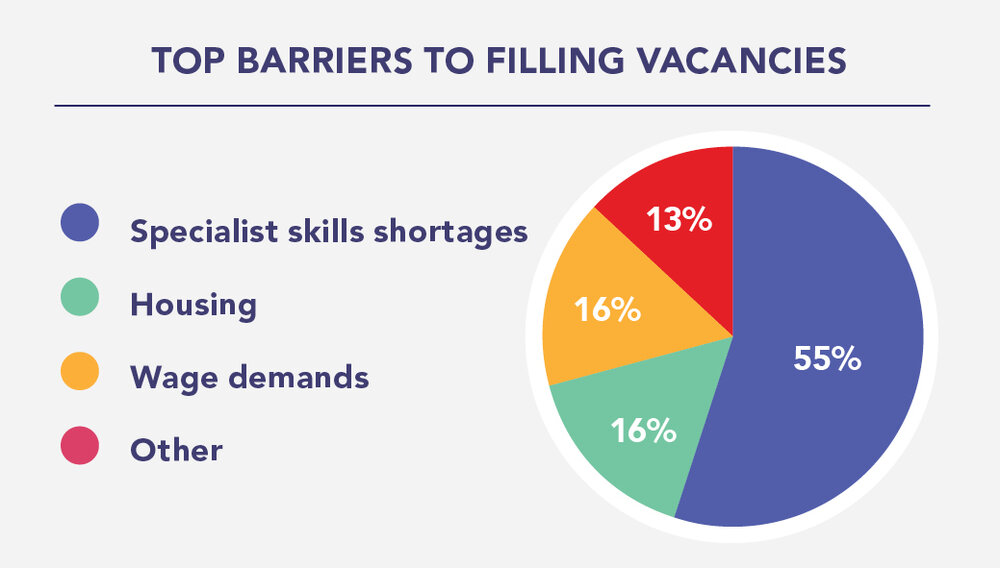 Of the 41% of respondents with vacancies advertised at present, 40% reported difficulties with filling these roles (with roles remaining vacant for 3 months or more). Specialist skills shortages emerged as the top barrier to filling vacancies.