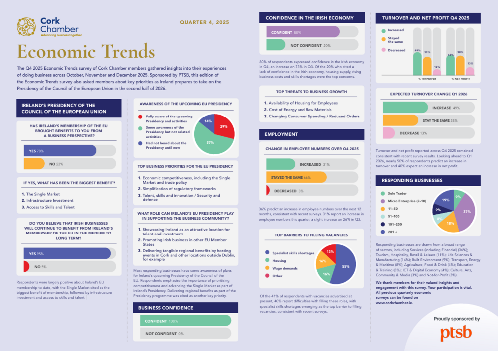 The Q4 2025 Economic Trends survey of Cork Chamber members gathered insights into their experience of doing business across October, November and December 2025.