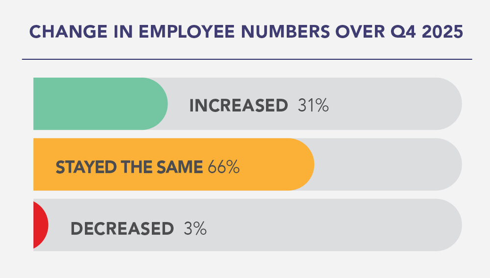 In Q4 2025, 66% of respondents reported that their employee numbers remained the same, while 31% saw an increase in employees.